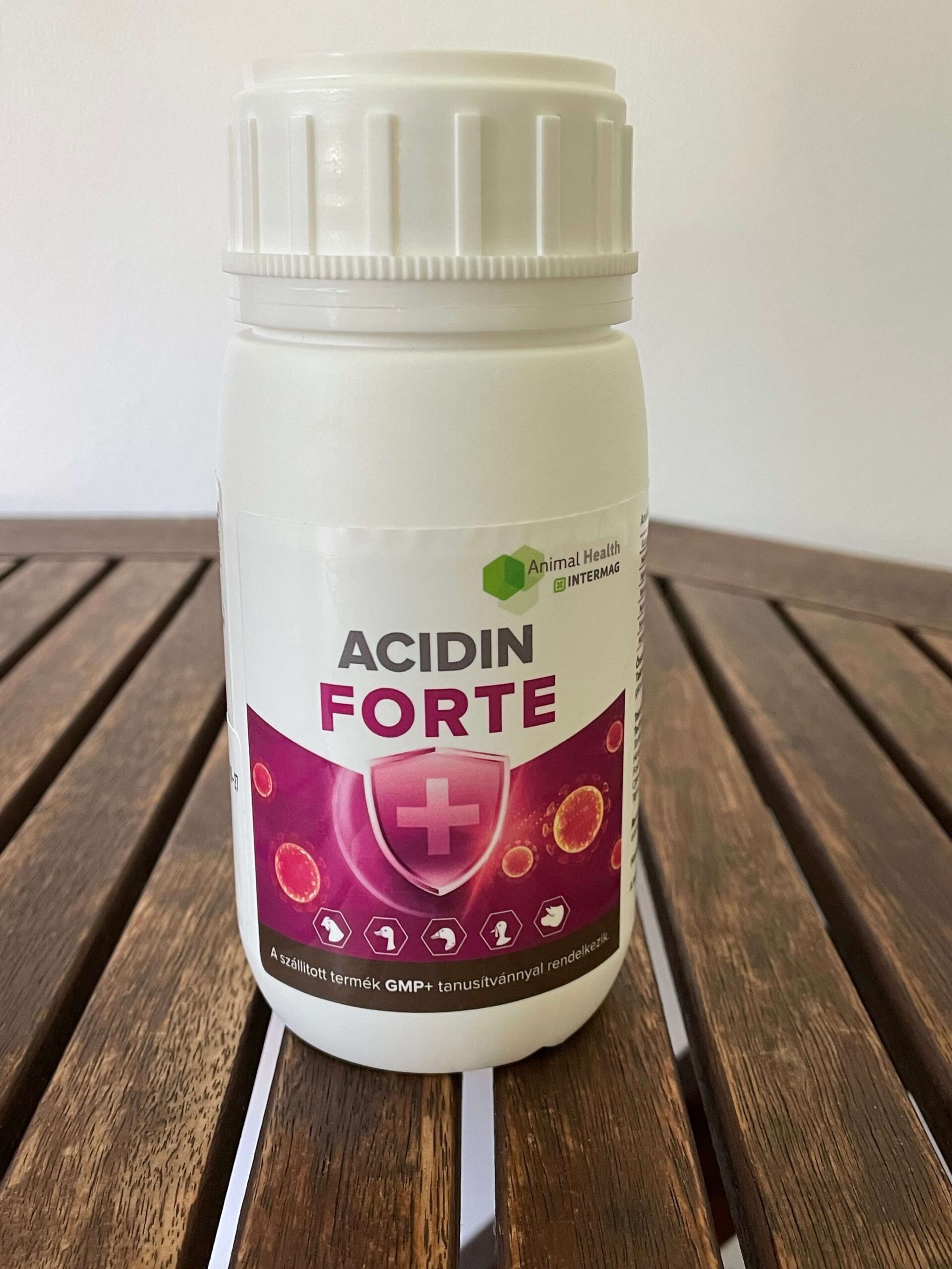 Az Acidin Forte egy ivóvíz savanyító készítmény. Rendszeresen alkalmazva csökkenti a nemkívánatos mikroflóra kialakulását a baromfi emésztőrendszerében. A takarmányhasznosításra is pozitív hatással van. Az ACIDIN FORTE az itatórendszerek tisztítására és fertőtlenítésére is ajánlott.